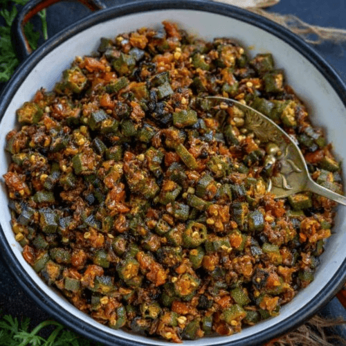 Tender okra cooked in tomato-onion gravy with Indian spices.