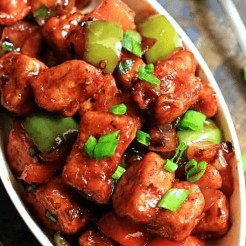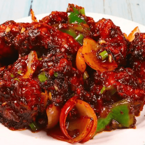 Tender chicken pieces sauteed with peppers and onions in a blend of Indo-Chinese sauces.