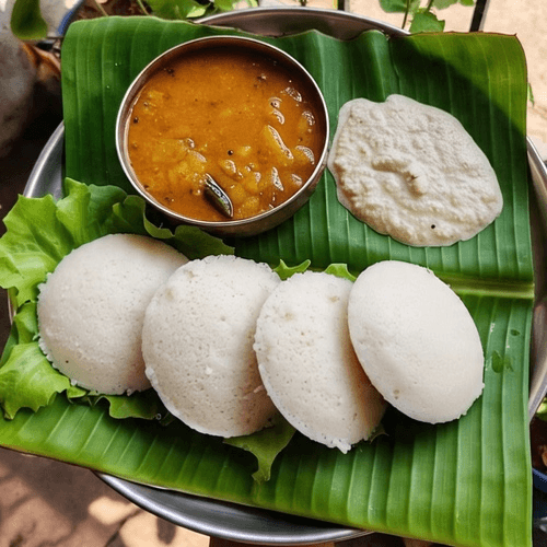 Streaming hot idlis (soft, fluffy rice cakes) served with a flavorful and aromatic sambar (lentil-based vegetable stew) made with split red lentils, vegetables, and a blend of spices, accompanied by a creamy coconut chutney. A classic South Indian combo that's comforting, nutritious, and utterly delicious!