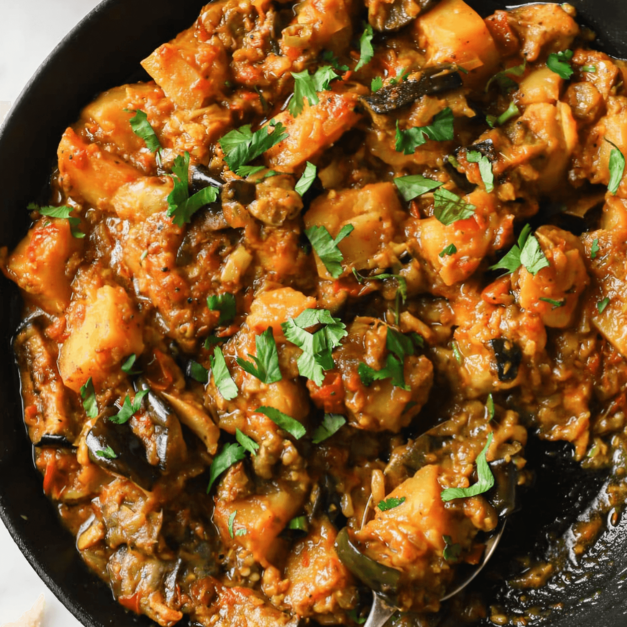 Roasted eggplant cooked with delicately-flavored spices and tomatoes.