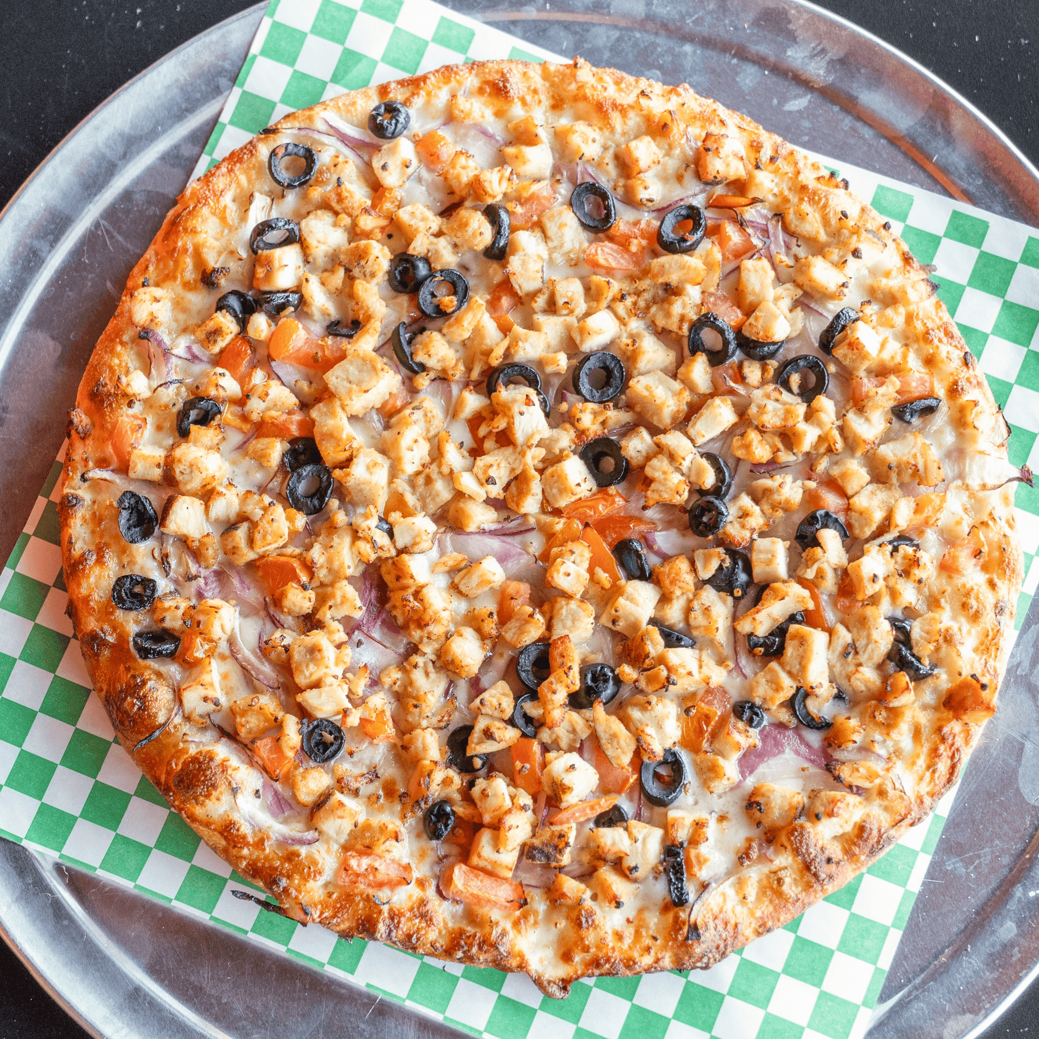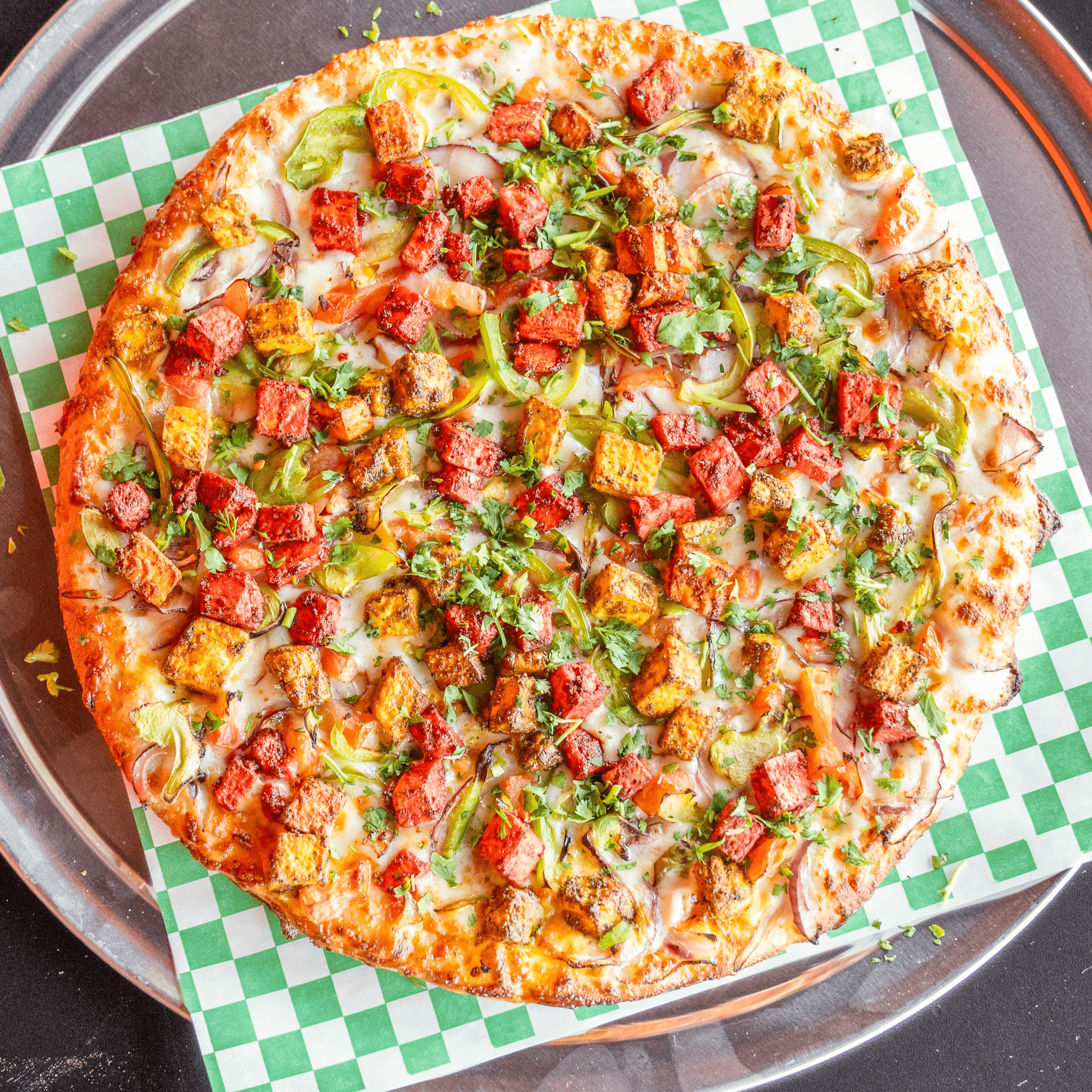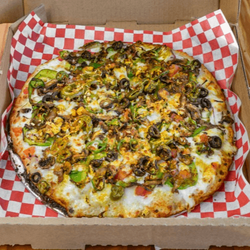 Red sauce, onions, tomatoes, olives, mushrooms, vegan sauce & fresh cilantro