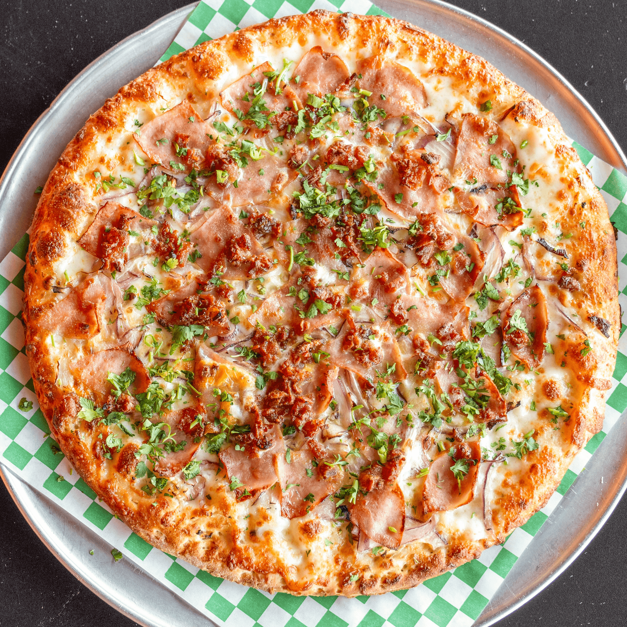 White sauce, onion, green chili, bacon, ham & fresh cilantro