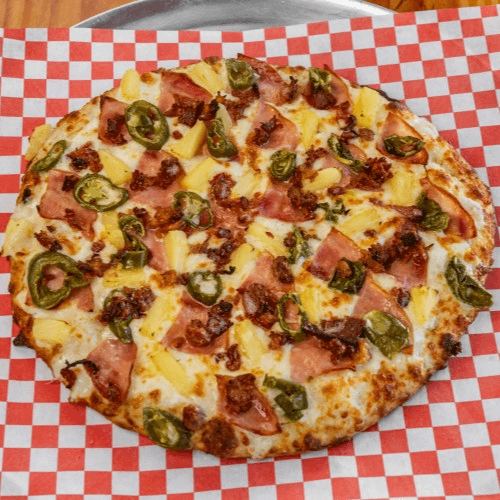 White sauce, Canadian ham, bacon, jalapeño & pineapple